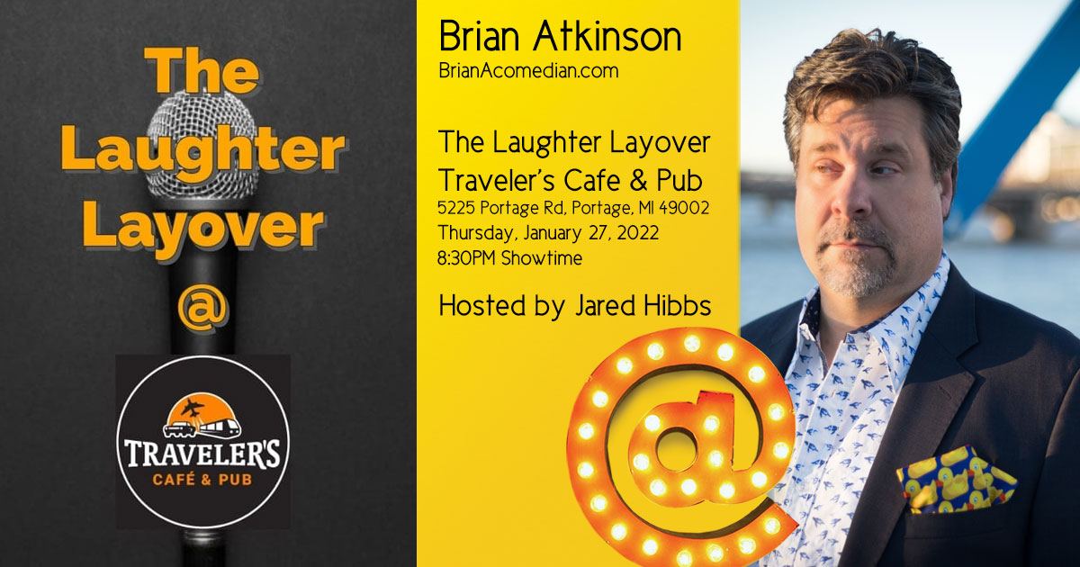 Brian Atkinson performs at The Laughter Layover at Traveler’s Cafe and Pub in Portage, MI, Thursday, January 27, 2022 – 8:30pm showtime.